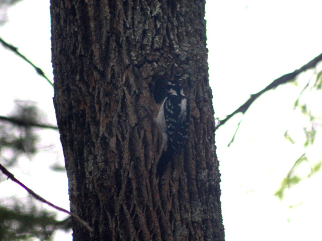I didn't expect to see the parents anytime soon after tramping around the area so I left, but came back late that evening, quietly, and settled in a discreet spot to see if I could learn who's nest it was. It took only about ten minutes before two loud birds came flying into the trees near the area, landed where I couldn't see them, and started sending out dramatic alert calls which told me they knew something wasn't right (me). Nonetheless, after a few minutes of this, a downy woodpecker - the female - flew onto the tree below the hole with a good size morsel of food that looked like a large insect, in its beak.