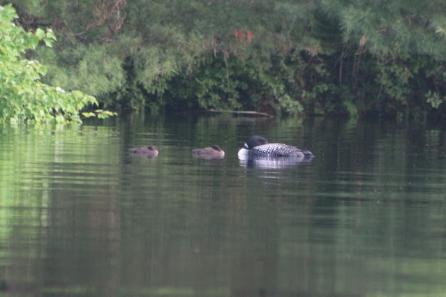 Earlier in the day the Loon Preservation Committee held their state-wide loon census from 8:00 to 9:00 and Lake Wicwas had four people combing the lake for loons. Dave and Marge Thorpe found a group of six loons carousing together in the southern portion of the lake, while Michael Marion and I found the family of mom, dad, Coco, and Jimmy, for a total of ten loons on our small lake - that may be record for our census day.
